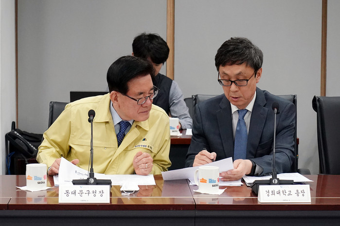 ▲21일(금) 오전 10시 30분, 서울시 기획상황실에서 열린 ‘코로나19 관련 중국 유학생 보호·지원방안에 대한 대책회의’에 참석한 유덕열 동대문구청장(왼쪽)이 한균태 경희대학교 총장과 코로나19 대응 방안을 논의하고 있다.(동대문구 제공) |