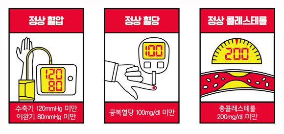 건강한 혈관을 위한 정상 수치는 혈압 120/80mmHg 미만이며, 공복 혈당은 100mg/dl 미만, 콜레스테롤은 200mg/dl 미만으로, 의사로부터 평소에 본인의 혈관 숫자를 잘 알고 있어야 한다는 얘기를 들었다.