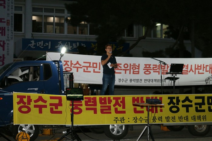 장수군 풍력발전설치 반대대책위는 지난 20일 장수군청 앞 광장에서 70~80대 어르신부터 초등학생 어린이까지 주민 150여명이 참여한 가운데 촛불 문화제를 진행했다.