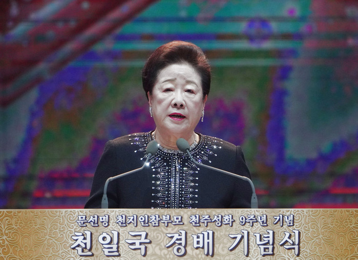 ▲24일 경기도 가평 청심월드센터에서 한학자 총재가 특별연설을 하고 있다. 가정연합 제공 |