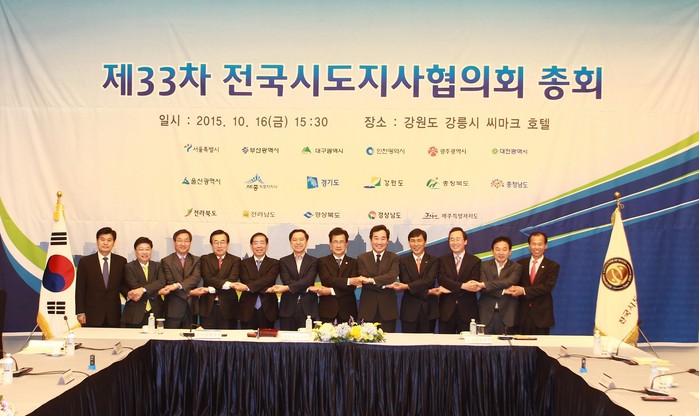 ▲16일 강원도 강릉시 씨마크호텔에서 열린 제33차 전국시도지사 총회에서 시도지사들이 손을 맞잡고 기념촬영을 하고 있다. 왼쪽부터 이춘희 세종시장, 권선택 대전시장, 유정복 인천시장, 서병수 부산시장, 박원순 서울시장, 김기현 울산시장, 이시종 충북도지사, 이낙연 전남도지사, 안희정 충남도지사, 송하진 전북도지사, 원희룡 제주도지사, 최문순 강원도지사. |