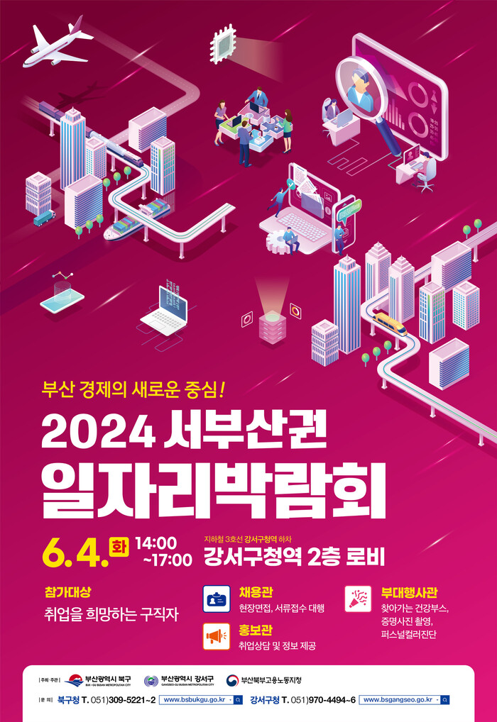 [로컬세계 부산=김민호 기자] 부산 북구는 다음 달 4일 부산지하철 3호선 강서구청역 2층 로비에서 ‘2024 서부산권 채용박람회’를 개최한다고 20일 밝혔다.