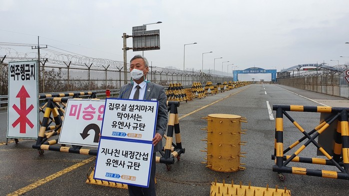 그러나 당초 조건부 동의를 했던 관할 군부대가 유엔(UN)사의 승인을 득하지 못했다는 이유로 집기 설치를 거부함에 따라, 10일 파주 통일대교에서 이를 규탄하는 온라인 기자회견을 연 후 임진각에 임시 집무실을 만들었다.