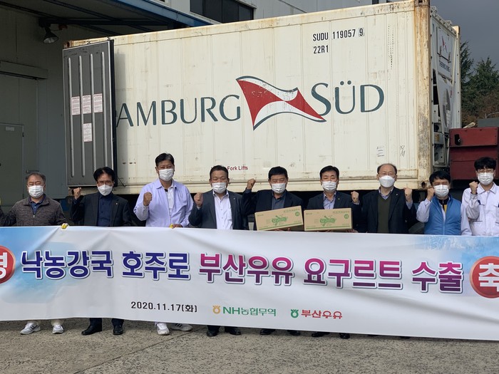 농협(회장 이성희) 경제지주 계열사인 NH농협무역(대표 김재기)은 부산우유협동조합(조합장 강래수, 이하 부산우유)이 생산한 농협요구르트 11톤을 호주로 수출하는 선적식을 17일 부산우유 울산공장에서 개최했다고 밝혔다.