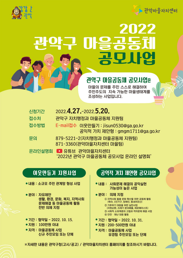 한편 구는 원활한 사업 추진을 위해 관악마을자치센터에서 사전 상담, 회계교육 등 컨설팅을 지원하고 있으며, 관악마을자치센터 유튜브 채널에 사업설명회 영상을 게시해 사업 안내, 사업제안서 작성 방법, 사업비 집행기준 등을 안내하고 있다.