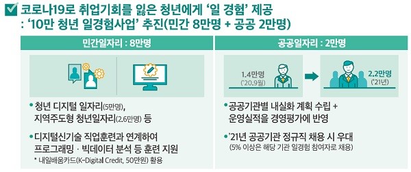 이와 함께 코로나 위기로 일할 기회마저 상실한 청년의 이력현상을 방지하기 위해 민간과 공공부문에서 ‘10만 청년 일경험 사업’도 적극 추진한다.