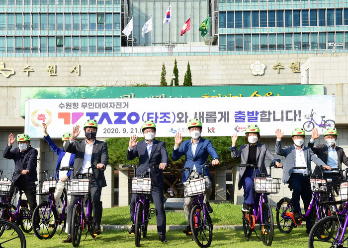 [로컬세계 고용주 기자]경기 수원시와 KT, 옴니시스템은 21일 수원시청 앞마당에서 수원형 무인대여자전거 ‘타조’(TAZO) 출시 행사를 열고, 새로운 무인대여 공유자전거 운영을 알렸다.