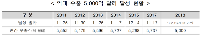 | ▲역대 수출 5000억 달러 달성 현황.(관세청 제공) |