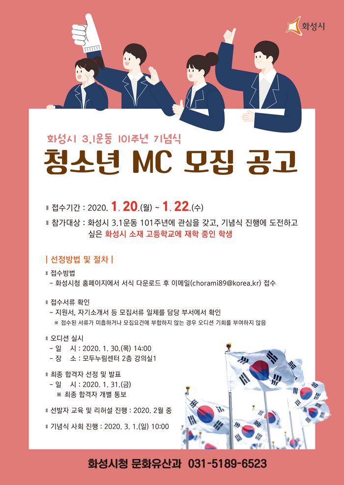 [로컬세계 고용주 기자]경기 화성시가 이달 20일부터 사흘간 3.1운동 101주년 기념식 청소년 MC를 모집한다.