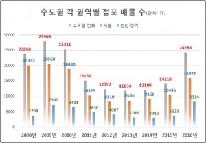 실제 올해 점포라인에 매매 의뢰된 수도권 점포 매물 수는 전년대비 72.02%(1만168개) 증가한 2만4286개로 DB구축이 시작된 2008년 이후 역대 3번째로 많은 것이다.