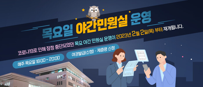 직장인, 맞벌이부부 등 바쁜 일상생활로 좀처럼 시청 내방이 어려운 주민들에게 편의를 제공하려는 취지로 실시되는 야간 민원실은 지난 2009년부터 운영해오다, 코로나19 확산 방지와 사회적 거리두기 등을 고려해 2020년 3월 중단한 바 있다.