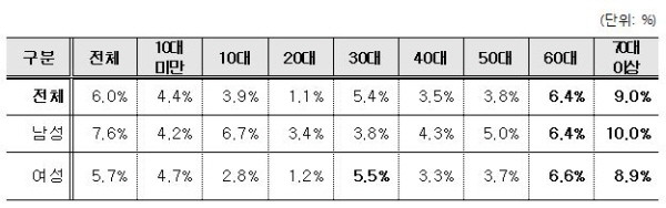 인구 10만 명당 연평균 증가율은 남성·여성 모두 노년층인 60대와 70대에서 높았다.