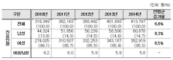 지난해 진료인원 성비를 보면 남성 6만 878명(14.7%), 여성 35만 2919명(85.3%)로 여성이 남성에 비해 5.8배 많은 수를 기록했다.