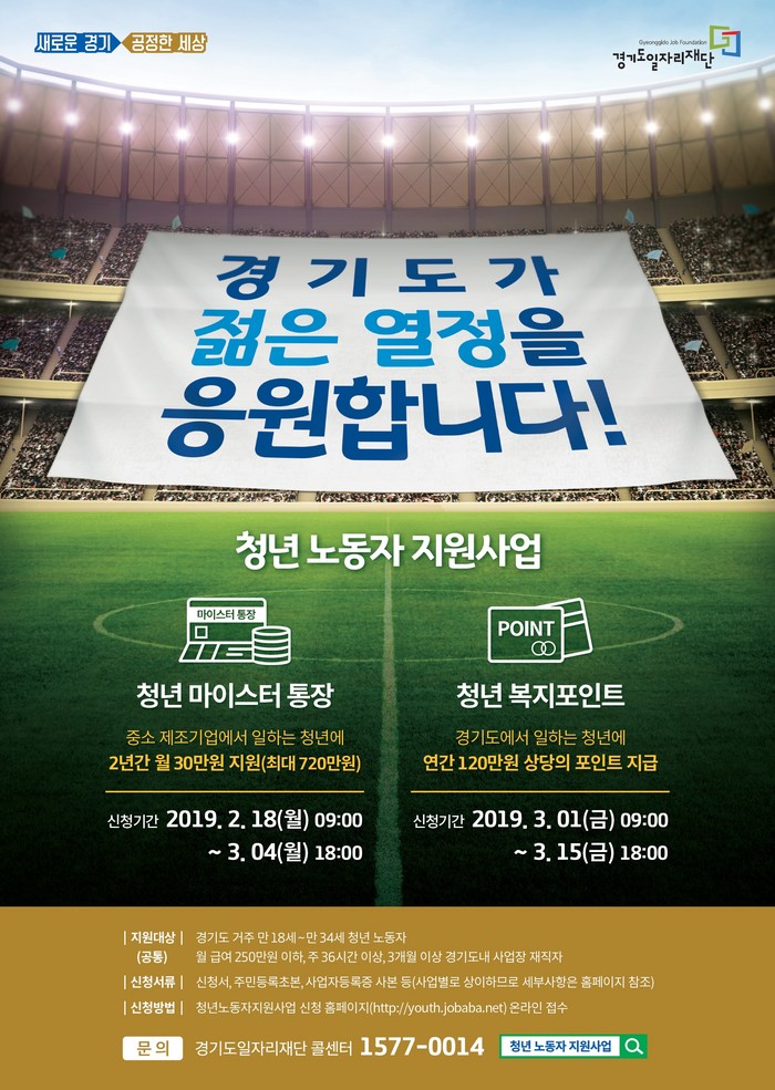 [로컬세계 고용주 기자]경기도는 ‘일하는 청년 복지포인트’와 ‘일하는 청년 마이스터 통장’으로 구성된 ‘2019년 경기 청년노동자 지원사업’ 대상자를 확대해 신규 모집 한다고 11일 밝혔다.
