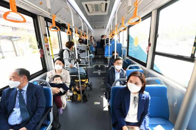 | ▲김포시는 다음달 1일부터 김포한강신도시 순환버스인 ‘한강이음버스’ 노선에 전기저상버스 2대를 추가 투입해 운행한다. 정식 운행에 앞서 29일 정하영 김포시장은 유모차 및 휠체어 이용객과 함께 교통약자 이용 불편사항을 사전 점검했다.(김포시 제공) |