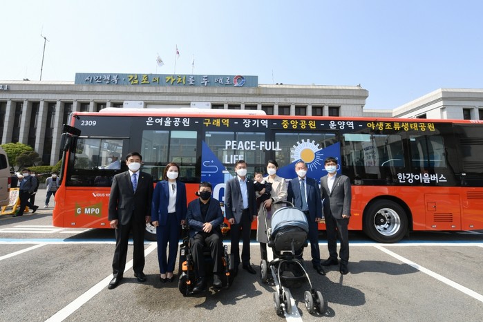 | ▲29일 정하영 김포시장이 유모차 및 휠체어 이용객과 함께 한강이음버스를 시승하고 있다. |