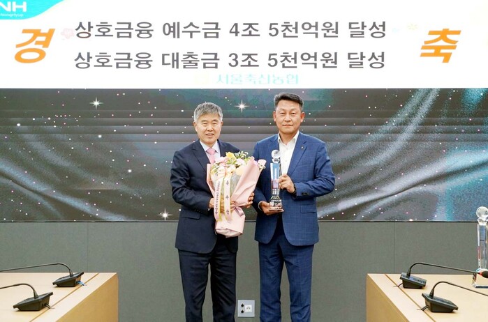 서울축산농협(조합장 진경만)이 29일 농협중앙회로부터 상호금융 예수금 4조 5천억원 달성탑과 대출금 3조 5천억원 달성탑을 수상하는 겹경사를 맞았다. 달성탑은 농협중앙회 서울본부장(김상수 본부장)이 서울축산농협 본점을 찾아 전달했다.