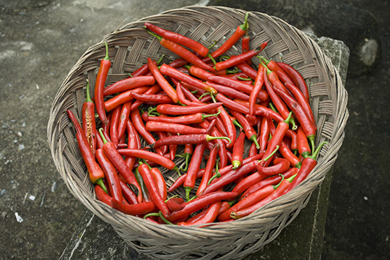다 익어서 빨갛게 된 홍고추는 제철이 따로 없는 채소다. 말려서 고춧가루로 만들면 김치부터 고추장까지 다양한 요리에 활용할 수 있다. 홍고추 속 캡사이신은 체내 지방을 분해하고 엔도르핀 분비를 촉진해 스트레스를 완화하며 혈액순환을 개선한다. 또 살균과 항균 효과가 있어 통증과 염증 완화에 좋다. 홍고추의 매운맛은 아드레날린 분비를 자극해 체온을 상승시키고 식욕을 돋운다. 홍고추는 다량의 클로로겐산을 함유해 발암 단백질 활성을 억제한다.