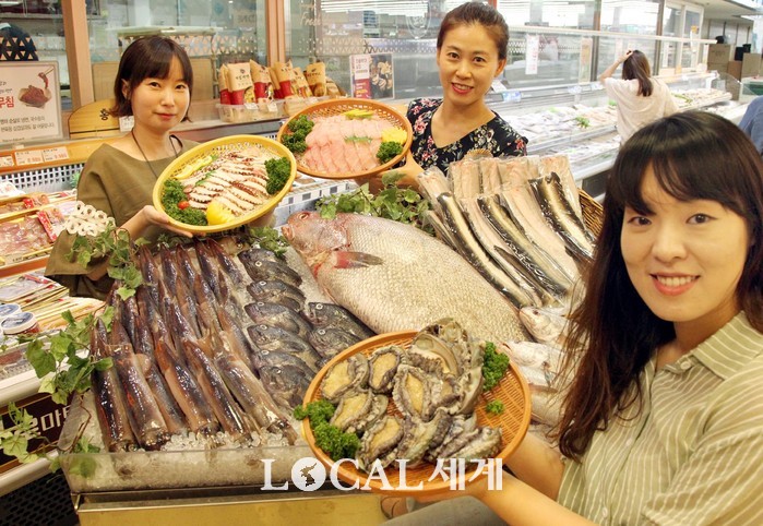 14일 서울 서초구 하나로마트 양재점에서 직원들이 대한민국 임시정부 수립 100주년과 광복 74주년을 맞아 국산 수산물 보양 상품전을 선보이고 있다. 농협유통 하나로마트는 무더위를 이기고 심신회복을 위해 제철 국산 수산물 보양식인 민어, 활전복, 장어(할복, HMR), 자숙문어, 생물 오징어를 이달 15일부터 18일까지 4일간 일자별 한정수량 할인 판매한다.