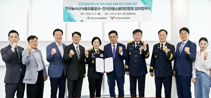 한국농수산식품유통공사(사장 김춘진)는 27일 나주 본사에서 전국의용소방대연합회(회장 김미경)와 함께 ESG 가치 실천과 저탄소 식생활 확산을 위한 업무협약을 체결했다.
