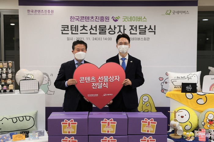 ‘콘텐츠 선물상자’ 전달식은 서울 영등포구에 위치한 굿네이버스에서 콘진원 조현래 원장, 굿네이버스 김중곤 사무총장이 참석한 가운데 24일 진행됐다. 또한, 이날 ‘이모티콘 클래스 & 원소스멀티유즈(OSMU, One Source Multi Use) 상품화 프로그램’에 참여한 이지원 작가와 권소연 작가도 전달식에 참석해 함께 응원의 마음을 전했다.