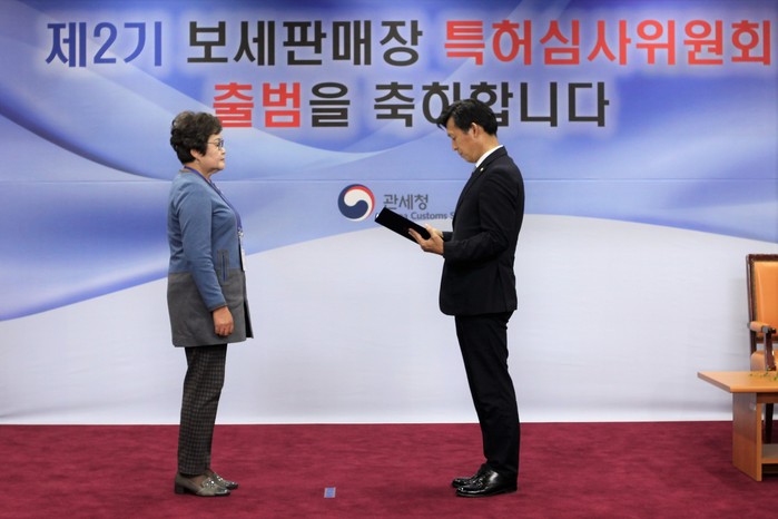 | ▲관세청은 4일 서울본부세관에서 제2기 보세판매장 특허심사위원 위촉행사를 개최했다. 김영문 관세청장(오른쪽)이 박 에스더 대한어머니회중앙회 회장에게 위촉장을 수여하고 있다.(관세청 제공) |