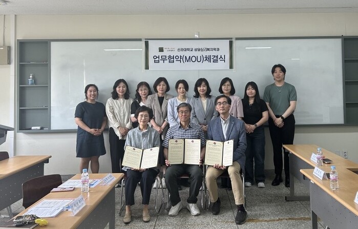 이날 협약식에는 북구청소년상담복지센터 센터장, 신라대학교 상담심리복지학과 학과장 최희경 교수, 가족치료학과·가족상담센터 센터장 이진희 교수를 비롯한 학생들이 참석했다.