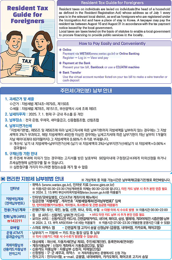 [로컬세계 = 맹화찬 기자] 부산 남구는 2025년도 정기분 주민세(개인분) 고지서에 외국인을 위한 영어 안내문을 뒷면에 함께 표기해 다문화 시대에 맞는 세정 서비스를 제공한다고 13일 밝혔다.