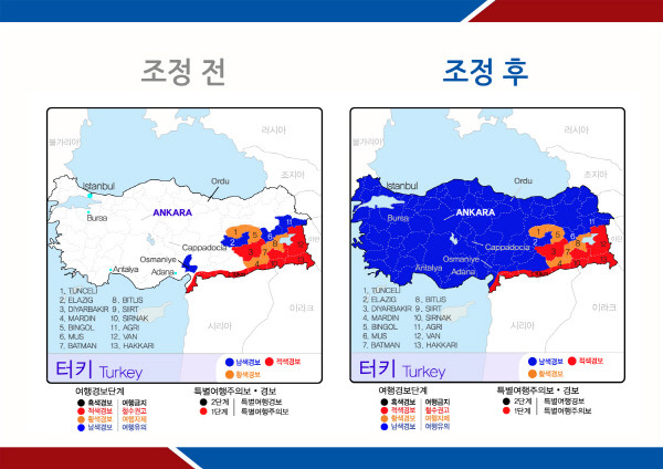 이에 따라 터키 내 여행경보는 이스탄불, 앙카라, 무스, 엘라직, 아그리, 오스마니아 주에 1단계 남색경보(여행유의)가 발령됐으며 툰셀리, 빙골, 비트리스, 바트만, 시리아와의 국경 10km 이내 제외한 마르딘에는 2단계 황색경보(여행자제)가, 하카리, 시르트, 시르낙, 반, 디야르바커 주, 마르딘 주 국경지역을 포함한 시리아와의 국경 10km 이내 지역에는 3단계 적색경보(여행자제)가 각각 발령 중이다.