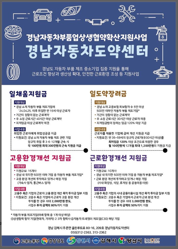 특히 창원은 경남 내 자동차 협력사가 가장 밀집된 곳으로 경상남도 및 김해·양산시와 같이 컨소시엄을 구성해 전국에서 가장 많은 국비 16억 원을 확보했다. 총사업비는 지방비를 포함한 20억 원으로 근로자에게는 일채움지원금과 일도약장려금을, 기업에는 고용환경 및 근로환경 개선지원금을 지원한다.