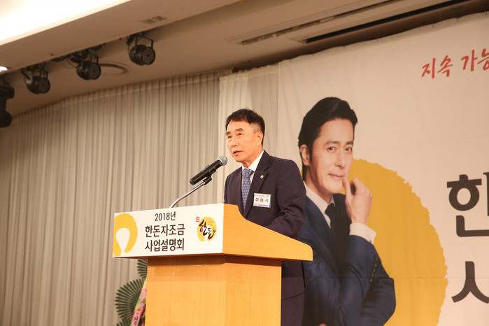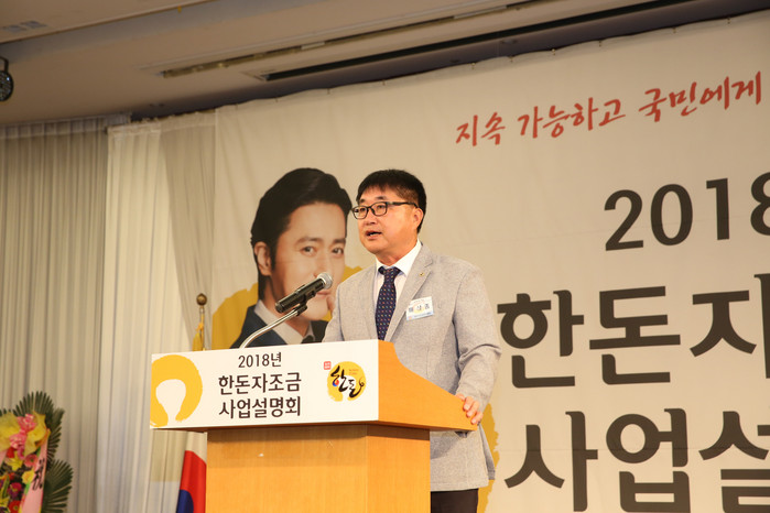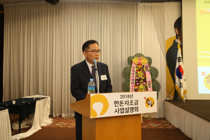 | ▲25일 ‘2018년 한돈자조금 사업설명회’에서 한돈자조금 하태식 위원장이 한돈자조금의 추진실적과 지속적인 한돈산업의 발전을 위해 모인 대의원 및 한돈산업 관련 종사자 대상으로 축사를 하고 있다.(한돈자조금 제공) |