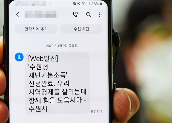 | ▲수원시 재난기본소득 신청완료 문자메시지.(수원시 제공) |
