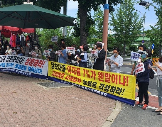 김 비대위원장은 “지난해 7월 31일 농협에서 새마을금고대주단으로 대환대출한 사람들의 경우 조합에서 현재까지 10개월 동안 이자를 내주고 있지만, 농협대주단에 계속 남아 있는 신용대출자 668명의 경우 조합에서 이자를 내주지 않은 채 각 개인에게 직접 이자를 부담시켜 22개월째 매월 평균 1인당 신용대출금 3500만원에 대한 이자(연리 7%) 21만원을 납부하게 하고 있다”라고 울분을 토로했다.