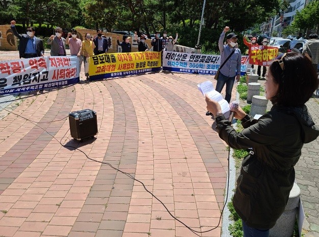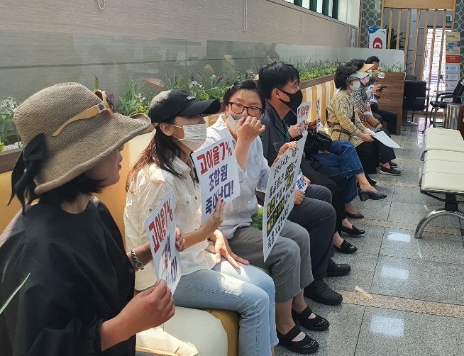 | ▲ 비대위 회원 40여명이 지난달 27일 오후 김해시 율하지주택 사무실 앞 광장에서 항의집회를 하고 있다. |