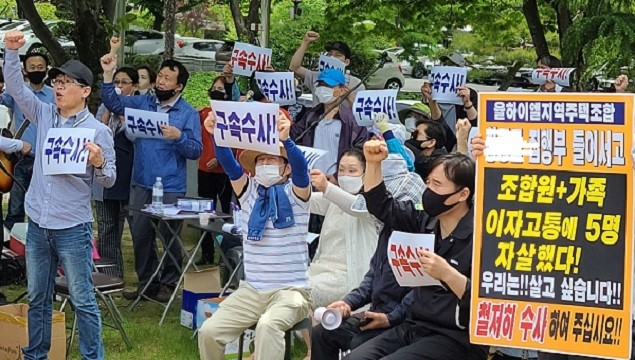 | ▲ 울하지주택 비대위 회원들이 지난 5월 7일 오전 창원시 경남도경찰청 앞에서 '율하이엘지주택 조합장에 대한 구속수사를 촉구'하는 집단집회를 열면서 구호를 외치고 있다. |
