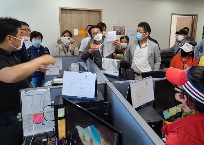 | ▲ 지난달 27일 비대위 회원 40여명이 경남 김해시 장유신도시 내 율하지주택 사무실에 몰려가 "월별자금사용명세서 등에 대한 정보를 공개하라"며 항의하고 있다. |