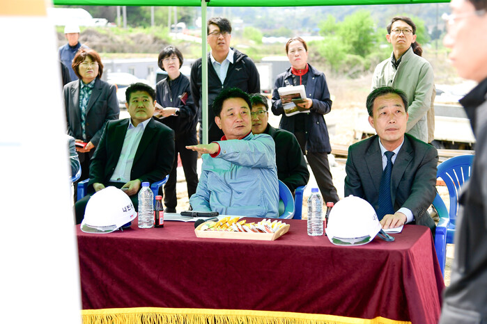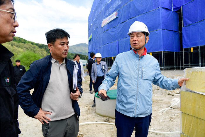 ▲지난달 최문순 화천군수가 간동면 유촌리의 화천 반다비 체육센터 건립 현장을 찾아 진척 상황을 점검하고 있다.(사진=화천군청제공) |