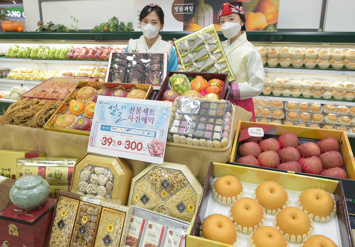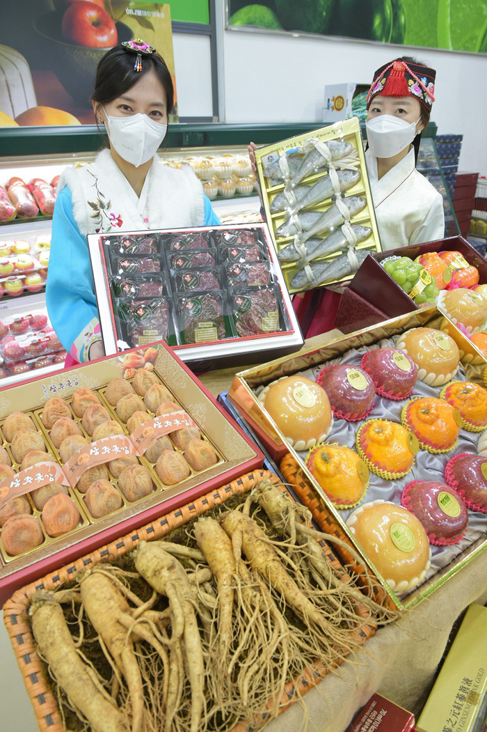 | ▲22일 서울 서초구 청계산로 하나로마트 양재점에서 모델들이 설 선물세트를 선보이고 있다. 농협유통은 21년 설 선물세트 사전예약 행사를 12월 24일부터 21년 1월 27일까지 35일간 진행한다. 하나로마트 양재·창동·전주점 등 22개 매장에서 행사카드 결제 시 최대 39% 할인 등 다양한 혜택이 준비되어 있다.(농협유통 제공) |