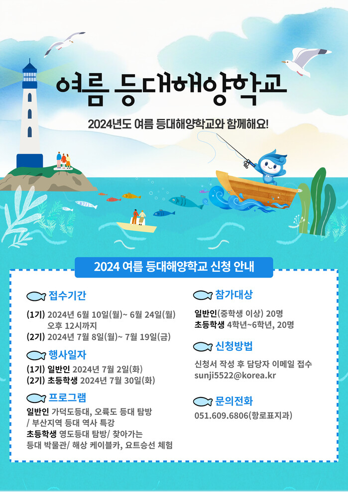 이번 여름 등대해양학교 참가 희망자는 부산지방해양수산청 누리집에서 신청서를 내려받아 오는 24일 오후 12시까지 참가 신청을 할 수 있다.