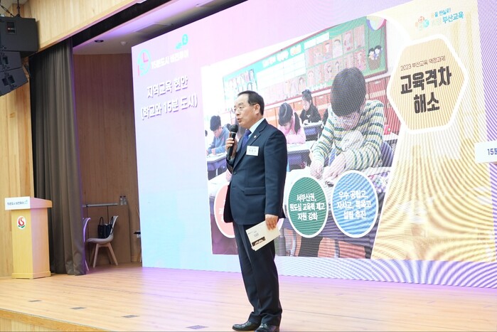 ▲하윤수 부산시교육감이 27일 오후 사하구청 대강당에서 열린 ‘부산시 15분 도시 비전투어’ 행사에 참석해 교육정책에 대해 브리핑을 하고 있다. 부산시교육청 제공 |