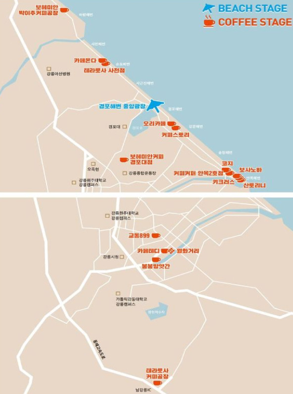경포(메인무대)와 강릉 커피거리가 있는 안목해변을 비롯해 하평해변, 사천해변 등에서 페스티벌이 열리는 동안 이 지역 15개 카페들이 재즈클럽으로 변신한다. 강릉 재즈프레소 페스티벌 커피 스테이지(Coffee Stage)는 경포·강문해변→안목해변→사천해변→시내 및 그 외 지역 등으로 이어진다.