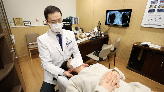 ▲잠실자생한방병원을 방문한 KT하키단 선수가 추나요법을 받고 있다. |