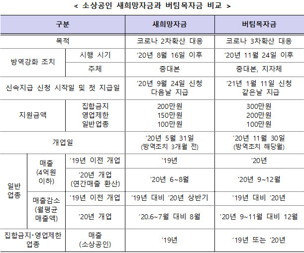 | ▲소상공인 새희망자금과 버팀목자금 비교표. |