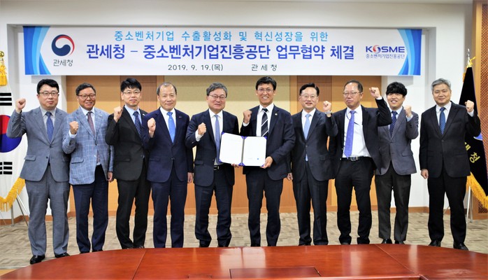 관세청 김영문 청장과 중소벤처기업진흥공단 이상직 이사장은 서울 강남구 서울세관 대회의실에서 중소벤처기업의 수출활성화 및 혁신성장을 위한 업무협약(MOU)을 19일 체결했다.