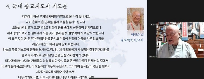 ▲15일 코로나19 종식을 위한 '지구촌 제3차 종교인 총 기도회'에 참여한 평인사 혜원스님. |