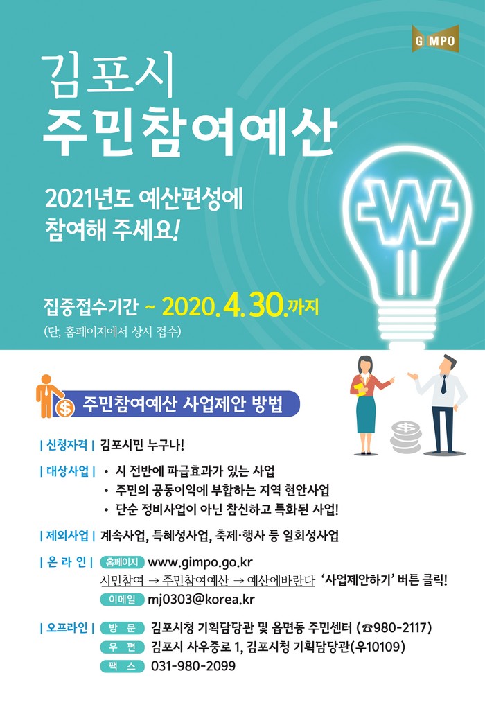 [로컬세계 김병민 기자]경기 김포시는 오는 4월 30일까지 2020년 주민참여예산 제안사업 공모를 진행한다고 2일 밝혔다.