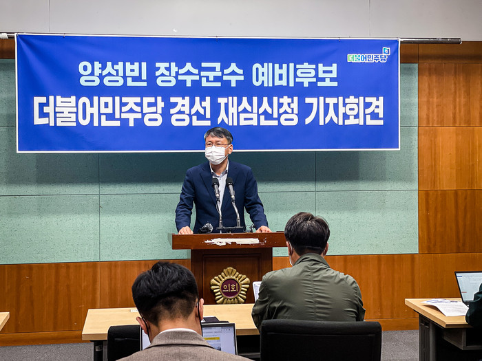 양 후보는 이날 전북도의회에서 기자회견을 열고 "민의를 배반하라는 게 아니라 경선 직후 장수군 곳곳에서 부정선거 정황이 포착됐다"라며 "금권·대리선거가 활개를 치는 현실과 고령층에 대한 우롱과 속임수가 도를 넘은 데 대한 경종을 울리고자 재심을 신청했다"고 밝혔다.