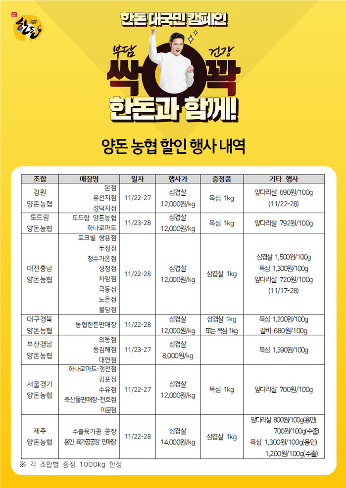 | ▲한돈자조금은 내달 2일까지 전국 7개 양돈조합 및 한돈 BI(Brand Identity)계약 1차 육가공업체 직영판매장에서 할인 및 증정행사를 진행한다. 사진은 양돈농협 할인행사내역. |