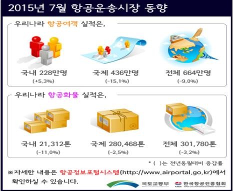 이러한 실적과 관련해 국토부는 “6월에 이어 7월에도 메르스(MERS) 영향으로 중국노선을 중심으로 국제선 항공여객이 감소세를 보였지만 국내선의 경우 이미 7월말 메르스 영향에서 대부분 벗어난 것으로 보인다”며 “공항공사의 8월 증가 국제선 항공편의 착륙료 면제, 해외여행사 초청 팸투어 및 설명회 등 민관합동 수요회복방안에 따라 8월부터 국제선 항공실적 감소폭도 점차 둔화되고 있다”고 분석했다.