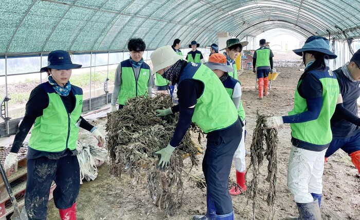 ▲집중호우 피해입은 전북 익산 농가 수해 복구 현장. 수해복구 중인 한국농수산식품유통공사 전북지역본부 직원들 |